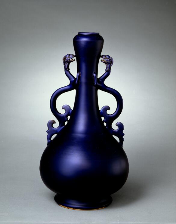 茄皮紫釉:始燒成于明弘治朝景德鎮(zhèn)窯,以清康熙朝制品為最好,并有淺、濃、老三種色調(diào),以螭耳瓶,膽式瓶,盤口瓶等式樣居多。茄皮紫釉雖然很厚,但沒有開片紋,釉色均勻肥厚,烏亮泛紫,十分美觀。茄皮紫釉瓷很少,故十分名貴。